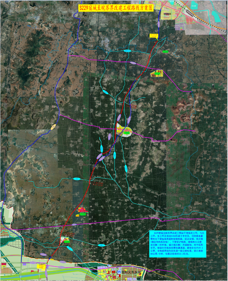 S229宿城至皖蘇界改建工程起于宿城北三環(huán),與北三環(huán)、東三環(huán)及S304形成十字交叉,沿老路走廊帶向北下穿泗許高速和宿淮鐵路,經(jīng)永安鎮(zhèn)、灰古鎮(zhèn)(鎮(zhèn)區(qū)均向西改線)、下穿京滬鐵路,繼續(xù)向北沿奎河西側(cè)(欄桿鎮(zhèn)、褚蘭鎮(zhèn)西側(cè))開辟新線,終于皖蘇交界,接徐州市規(guī)劃徐賈快速通道。采取雙向四車道一級(jí)公路建設(shè)標(biāo)準(zhǔn),路線全長約49.5公里。項(xiàng)目總投資約33.2億元,計(jì)劃2024年初開工,2025年底完工。